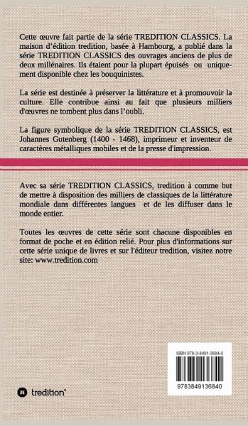 Cette uvre (édition relié) fait partie de la série TREDITION CLASSICS. La maison d édition tredition, basée à Hambourg, a publié dans la série TREDITION CLASSICS des ouvrages anciens de plus de deux millénaires. Ils étaient pour la plupart épuisés ou uniquement disponible chez les bouquinistes. La série est destinée à préserver la littérature et à promouvoir la culture. Avec sa série TREDITION CLASSICS, tredition à comme but de mettre à disposition des milliers de classiques de la littérature mondiale dans différentes langues et de les diffuser dans le monde entier.
