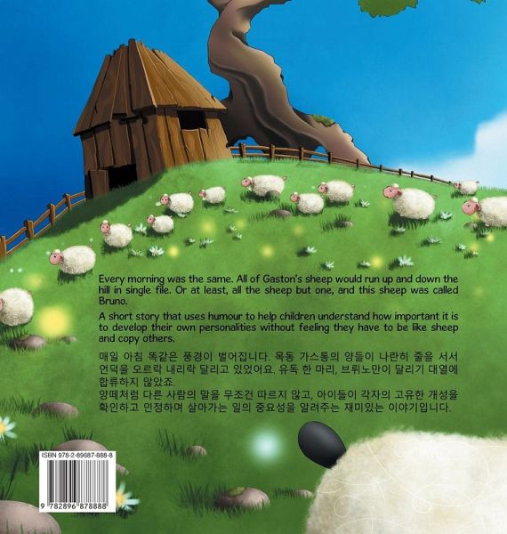Bilingual book in English - Korean. Every morning was the same. All of Gaston's sheep would run up and down the hill in single file. Or at least, all the sheep but one, and this sheep was called Bruno. A short story that uses humour to help children understand how important it is to develop their own personalities without feeling they have to be like sheep and copy others. Ages: 6 - 8. ¿¿ ¿¿ ¿¿ ¿-¿¿¿ ¿¿ ¿¿ ¿¿¿ ¿¿¿ ¿¿¿¿¿. ¿¿ ¿¿¿¿ ¿¿¿ ¿¿¿ ¿¿ ¿¿ ¿¿¿ ¿¿¿ ¿¿¿ ¿¿¿ ¿¿¿¿. ¿¿ ¿ ¿¿, ¿¿¿¿¿ ¿¿¿ ¿¿¿ ¿¿¿¿ ¿¿¿. ¿¿¿¿ ¿¿ ¿¿¿ ¿¿ ¿¿¿ ¿¿¿ ¿¿, ¿¿¿¿ ¿¿¿ ¿¿¿ ¿¿¿ ¿¿¿¿ ¿¿¿¿ ¿¿¿¿ ¿¿ ¿¿¿¿ ¿¿¿¿ ¿¿¿¿ ¿¿¿¿¿¿. ¿¿ : 6-8 ¿.