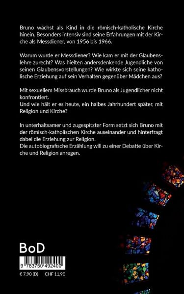 Bruno wächst als Kind in die römisch-katholische Kirche hinein. Besonders intensiv sind seine Erfahrungen mit der Kirche als Messdiener, von 1956 bis 1966. Warum wurde er Messdiener? Wie kam er mit der Glaubenslehre zurecht? Was hielten andersdenkende Jugendliche von seinen Glaubensvorstellungen? Wie wirkte sich seine katholische Erziehung auf sein Verhalten gegenüber Mädchen aus? Mit sexuellem Missbrauch wurde Bruno als Jugendlicher nicht konfrontiert. Und wie hält er es heute, ein halbes Jahrhundert später, mit Religion und Kirche? In unterhaltsamer und zugespitzter Form setzt sich Bruno mit der römisch-katholischen Kirche auseinander und hinterfragt dabei die Erziehung zur Religion. Die autobiografische Erzählung will zu einer Debatte über Kirche und Religion anregen.