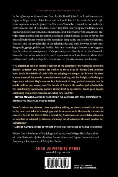 In the 1980s a poor farmer's son from Recife, Brazil, joined the Brazilian navy and began selling cocaine. After his arrest in Rio de Janeiro he spent the next eight years in prison, where he joined the Comando Vermelho criminal faction and eventually became one of its leaders. Robert Gay tells this young man's dramatic and captivating story in Bruno. In his shockingly candid interviews with Gay, Bruno provides many insights into the criminal world in which he lived: details of day-to-day prison life; the inner workings of the Brazilian drug trade; the structure of criminal factions; and the complexities of the relationships and links between the prisons, drug trade, gangs, police, and favelas. And most stunningly, Bruno's story suggests that Brazilian mismanagement of the prison system directly led to the Comando Vermelho and other criminal factions' expansion into Rio's favelas, where their turf wars and battles with police have terrorized the city for over two decades.