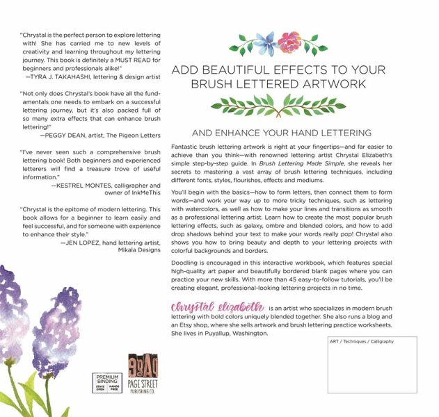 Add Beautiful Effects to Your Brush Lettered Artwork and Enhance Your Hand Lettering Fantastic brush lettering artwork is right at your fingertips-and far easier to achieve than you think-with renowned lettering artist Chrystal Elizabeth's simple step-by-step guide. In Brush Lettering Made Simple, she reveals her secrets to mastering a vast array of brush lettering techniques, including di erent fonts, styles, flourishes, e ects and mediums. You'll begin with the basics-how to form letters, then connect them to form words-and work your way up to more tricky techniques, such as lettering with watercolors, as well as how to make your lines and transitions as smooth as a professional lettering artist. Learn how to create the most popular brush lettering e ects, such as galaxy, ombre and blended colors, and how to add drop shadows behind your text to make your words really pop! Chrystal also shows you how to bring beauty and depth to your lettering projects with colorful backgrounds and borders. Doodling is encouraged in this interactive workbook, which features special high-quality art paper and beautifully bordered blank pages where you can practice your new skills. With more than 45 easy-to-follow tutorials, you'll be creating elegant, professional-looking lettering projects in no time.