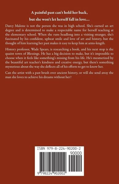 A painful past can't hold her back, but she won't let herself fall in love... Darcy Malone is determined to make a respectable name for herself teaching at the elementary school no matter how others treat her. When she runs headfirst into a visitor to town, she's fascinated by his upbeat smile and love of history, but the thought of him learning her past makes it easy to keep him at arms-length. Wade Spears is researching a book in the quaint town of Blessings, Kansas. He has a big decision to make, but it's impossible to choose when it feels like something's missing from his life. He's mesmerized by the beautiful art teacher's kindness and creative energy, but there's something mysterious about the way she deflects all of his efforts to get to know her. Can an artist brush over her painful past, or will she send away the man she loves to chase his dreams without her? This sweet novella is a quick read with clean and wholesome romance.