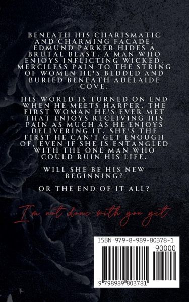 "I'm not done with you yet." Beneath his charismatic and charming facade, Edmund Parker hides a brutal beast. A man who enjoys inflicting wicked, merciless pain to the string of women he's bedded and buried beneath Adelaide Cove. His world is turned on end when he meets Harper, the first woman he's ever met that enjoys receiving his pain as much as he enjoys delivering it. She's the first he can't get enough of, even if she is entangled with the one man who could ruin his life. Will she be his new beginning? Or the end of it all?