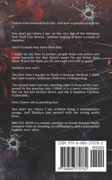 We're known for our savagery. We run New York City. We control every inch of it and anyone that gets in our way is executed. I protect the people from con artists and thugs like the cartel. But I'm not a good guy. I loathe thinking of myself as a vigilante. And did I mention that my little sister tried to put me behind bars? When a young woman's car breaks down in the rain, I'm feeling overly generous. I recognize her, she's a nurse from Steele Concierge Medical, at least that's what she wants me to believe… I bring her into my compound to protect her during the storm. But she betrays me. Turns out that she's FBI, working undercover, and intends on destroying the Bratva from the inside. Now that I know the truth, who will protect her from me? BRUTAL BOSS is a steamy enemies to lovers Russian Mafia romance. It can be read as a standalone novel. The Bratva Brothers were previously introduced in Ruthless Vow (Mafia Marriages Book Five). It is not required that you have read Ruthless Vow before reading any of the Bratva Brothers series books. No cheating. No cliffhanger. Happily Ever After ending.