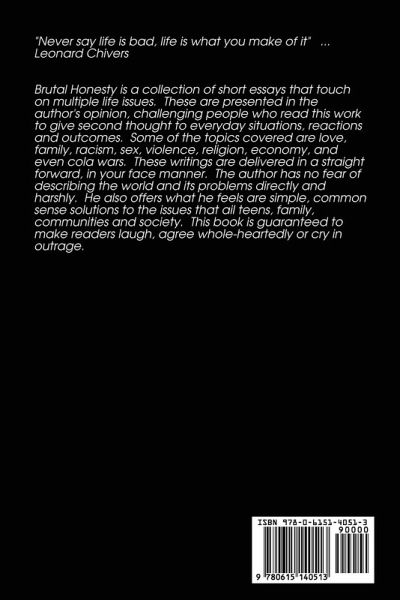 Brutal Honesty is a collection of short essays that touch on multiple life issues. These are presented in the author's opinion, challenging people who read this work to give second thought to everyday situations, reactions and outcomes. Some of the topics covered are love, family, racism, sex, violence, religion, economy, and even cola wars. These writings are delivered in a straight forward, in your face manner. The author has no fear of describing the world and its problems directly and harshly. He also offers what he feels are simple, common sense solutions to the issues that ail teens, family, communities and society. This book is guaranteed to make readers laugh, agree whole-heartedly or cry in outrage. You can check out my web site and blog at www.mybrutalhonesty.com