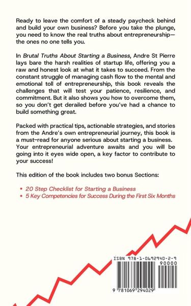 Ready to leave the comfort of a steady paycheck behind and build your own business? Before you take the plunge, you need to know the real truths about entrepreneurship- the ones no one tells you. In Brutal Truths About Starting a Business, Andre St Pierre lays bare the harsh realities of startup life, offering you a raw and honest look at what it takes to succeed. Inside, you'll discover how to:Navigate cash flow problems and keep your business afloat even when money is tight Protect your mental health and avoid burnout while juggling the many hats of entrepreneurship Build a business model that can survive the harsh reality of market competition and financial stress Set realistic goals and avoid the pitfalls that many new entrepreneurs fall into Turn your passion into profit and scale your business without sacrificing your well-being This edition of the book includes two bonus Sections:20 Step Checklist for Starting a Business 5 Key Competencies for Success During the First Six Months