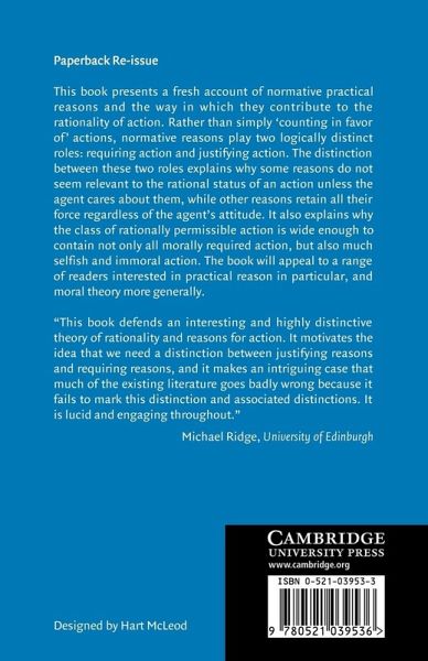 This book presents a new account of normative practical reasons and the way in which they contribute to the rationality of action. Rather than simply 'counting in favour of' actions, normative reasons play two logically distinct roles: requiring action and justifying action. The distinction between these two roles explains why some reasons do not seem relevant to the rational status of an action unless the agent cares about them, while other reasons retain all their force regardless of the agent's attitude. It also explains why the class of rationally permissible action is wide enough to contain not only all morally required action, but also much selfish and immoral action. The book will appeal to a range of readers interested in practical reason in particular, and moral theory more generally.