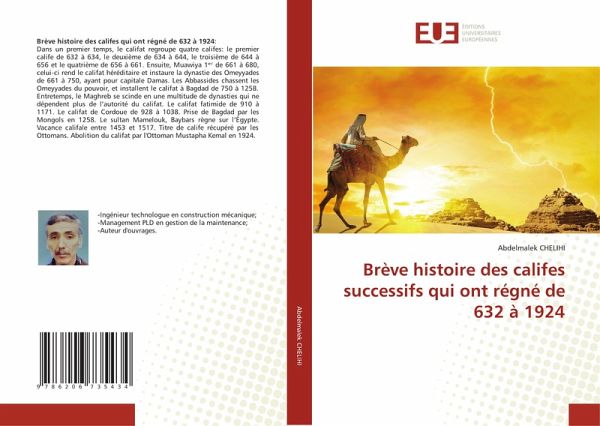 Brève histoire des califes qui ont régné de 632 à 1924:Dans un premier temps, le califat regroupe quatre califes: le premier calife de 632 à 634, le deuxième de 634 à 644, le troisième de 644 à 656 et le quatrième de 656 à 661. Ensuite, Muawiya 1 de 661 à 680, celui-ci rend le califat héréditaire et instaure la dynastie des Omeyyades de 661 à 750, ayant pour capitale Damas. Les Abbassides chassent les Omeyyades du pouvoir, et installent le califat à Bagdad de 750 à 1258. Entretemps, le Maghreb se scinde en une multitude de dynasties qui ne dépendent plus de l'autorité du califat. Le califat fatimide de 910 à 1171. Le califat de Cordoue de 928 à 1038. Prise de Bagdad par les Mongols en 1258. Le sultan Mamelouk, Baybars règne sur l'Égypte. Vacance califale entre 1453 et 1517. Titre de calife récupéré par les Ottomans. Abolition du califat par l'Ottoman Mustapha Kemal en 1924.