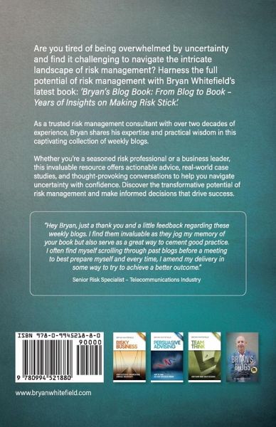 Are you tired of feeling overwhelmed by uncertainty and struggling to navigate the complex world of risk management? Look no further than Bryan Whitefield's latest book, "Bryan's Blog Book: From Blog to Book - Three Years of Weekly Insights on Navigating Risk Management." With over two decades of experience as a renowned risk management consultant, Bryan Whitefield has distilled his vast knowledge and practical wisdom into this invaluable resource. In this captivating collection of weekly blogs, Bryan shares his reflections, top tips, and thought-provoking conversations on a wide range of risk-related topics. Whether you're a seasoned risk professional, a business leader, or simply someone eager to harness the benefits of risk management, this book is a must-read. Bryan's expertise shines through as he demystifies the role and function of risk management, empowering you to embrace uncertainty and make informed decisions with confidence and agility. Discover the transformative power of risk management, backed by real-world case studies and actionable advice. Bryan's engaging writing style and wealth of experience make "Bryan's Blog Book" a captivating and enlightening read. Don't miss out on this opportunity to enhance your risk management skills and navigate the ever-changing landscape of uncertainty. Get your copy today and embark on a journey of empowerment and success in managing risk.