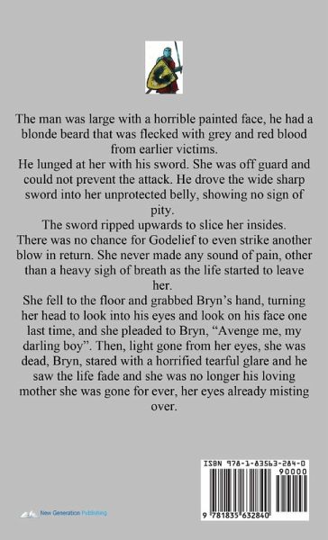 The man was large with a horrible painted face, he had a blonde beard that was flecked with grey and red blood from earlier victims. He lunged at her with his sword. She was off guard and could not prevent the attack. He drove the wide sharp sword into her unprotected belly, showing no sign of pity. The sword ripped upwards to slice her insides. There was no chance for Godelief to even strike another blow in return. She never made any sound of pain, other than a heavy sigh of breath as the life started to leave her. She fell to the floor and grabbed Bryn's hand, turning her head to look into his eyes and look on his face one last time, and she pleaded to Bryn, "Avenge me, my darling boy". Then, light gone from her eyes, she was dead, Bryn, stared with a horrified tearful glare and he saw the life fade and she was no longer his loving mother she was gone for ever, her eyes already misting over.