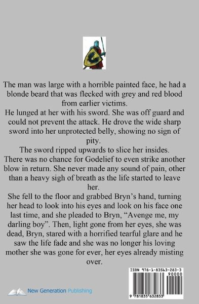 The man was large with a horrible painted face, he had a blonde beard that was flecked with grey and red blood from earlier victims. He lunged at her with his sword. She was off guard and could not prevent the attack. He drove the wide sharp sword into her unprotected belly, showing no sign of pity. The sword ripped upwards to slice her insides. There was no chance for Godelief to even strike another blow in return. She never made any sound of pain, other than a heavy sigh of breath as the life started to leave her. She fell to the floor and grabbed Bryn's hand, turning her head to look into his eyes and look on his face one last time, and she pleaded to Bryn, "Avenge me, my darling boy". Then, light gone from her eyes, she was dead, Bryn, stared with a horrified tearful glare and he saw the life fade and she was no longer his loving mother she was gone for ever, her eyes already misting over.