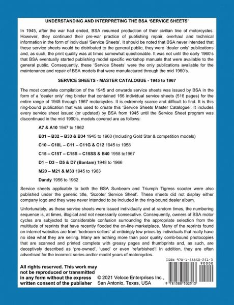 More than 550 illustrations and charts, size 8.25x10.75 inches. In 1945, after the war had ended, BSA resumed production of their civilian line of motorcycles. However, they continued their pre-war practice of publishing repair, overhaul and technical information in the form of individual 'Service Sheets'. It should be noted that BSA never intended that these service sheets would be distributed to the general public, they were 'dealer only' publications and the print quality was at times somewhat questionable. It was not until the early 1960's that BSA eventually started publishing model specific workshop manuals that were available to the general public. Consequently, these 'Service Sheets' were the only publications available for the maintenance and repair of BSA models that were manufactured through the mid 1960's. The most complete compilation of the 1945 and onwards service sheets was issued by BSA in the form of a 'dealer only' ringbinder that contained 166 individual service sheets (516 pgs) for the entire range of 1945 thru 1967 motorcycles. It is extremely difficult to find. It is this ring-bound publication that was used to create this 'Service Sheets Master Catalogue'. It includes every service sheet issued/updated by BSA from 1945 until the Service Sheet program was discontinued in the mid 1960's, models covered are as follows: A7 & A10 1947-62 B31-B32-B33 and B34 1945-60 (Inc. Gold Star & competition models) C10-C10L-C11-C11G and C12 1945-58 C15-C15T-C15S-C15SS and B40 1958-67 D1-D3-D5 and D7 (Bantam) 1948-66 M20-M21 and M33 1945-63 Dandy 1956-62 At some point in the 1930's, BSA adopted the practice of identifying their various model types by 'groups' and the models manufactured from 1945 through the mid 1960's were in Groups A, B, C, D and M. The service sheets that were associated to a particular group were identified numerically and, while there were some exceptions due to overlapping data between models, in general terms the numbers relate to a particular model group. They are as follows: The 200 series of service sheets were applicable to Group A models, the 300 series to Group B, the 400 series to Group C, the 500 series to Group D and the 600 series to Group M. In addition, there were a 700 series applicable to mechanical maintenance and an 800 series for electronic service and wiring diagrams. Both the 700 and 800 series of service sheets contained information that was not model specific but was applicable across multiple model groups. Finally, there were a 900 series for the BSA Dandy and a 1000 series for the BSA Sunbeam and Triumph Tigress scooter. The 1000 series sheets were published under the generic title, 'Scooter Service Sheet'. These sheets did not display either company logo and they were never intended to be included in the ring-bound dealer album. Unfortunately, as these service sheets were issued individually and at random times, the numbering sequence within any group is, at times, illogical and not necessarily consecutive. Consequently, owners of BSA motorcycles are subjected to considerable confusion surrounding the appropriate selection from the multitude of reprints that have recently flooded the online marketplace. Many of the reprints found on internet websites are from 'bedroom sellers' at enticingly low prices by individuals that really have no idea what they are selling. Many are nothing more than poor quality comb-bound photocopies that are scanned and printed complete with greasy pages and thumbprints and are deceptively described as 'pre-owned', 'used' or even 'refurbished'! In addition, they are often advertised for the incorrect series and/or model years of motorcycles.