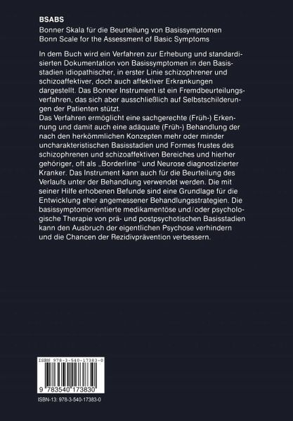 Die Erfassung von BS ist bisher bei der Erhebung der Anamnese und des psychischen Befundes noch keineswegs uner1aB1icher Be standtei1 der k1inischen Diagnostik. Auch in den ge1aufigen diagnostischen Systemen und Fremdbeurtei1ungsverfahren und in den entsprechenden Kriterien des DSM-III sind die BS nicht be rUcksichtigt oder, sofern einige von ihnen angefUhrt sind, nicht zureichend definiert. Die Bonner Skala fUr die Beurtei1ung von Basissymptomen (Bonn Scale for the Assessment of Basic Symptoms = der "BSABS") ist ein standardisiertes Verfahren zur Erhebung und Dokumentation der…mehr