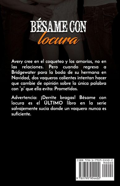 Avery cree en el coqueteo y los amoríos, no en las relaciones. Pero cuando regresa a Bridgewater para la boda de su hermana en Navidad, dos vaqueros calientes intentan hacer que cambie de opinión sobre la única palabra con "p" que ella evita: Prometidos. Advertencia: ¡Derrite bragas! Bésame con locura es el ÚLTIMO libro en la serie salvajemente sucia donde un vaquero nunca es suficiente. Este final feliz independiente se trata sobre ella - no H/H.