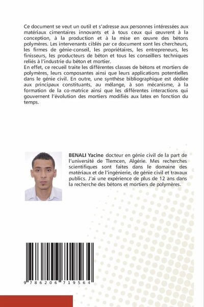 Ce document se veut un outil et s'adresse aux personnes intéressées aux matériaux cimentaires innovants et à tous ceux qui oeuvrent à la conception, à la production et à la mise en oeuvre des bétons polymères. Les intervenants ciblés par ce document sont les chercheurs, les firmes de génie-conseil, les propriétaires, les entrepreneurs, les finisseurs, les producteurs de béton et tous les conseillers techniques reliés à l'industrie du béton et mortier.En effet, ce recueil traite les différentes classes de bétons et mortiers de polymères, leurs composantes ainsi que leurs applications potentielles dans le génie civil. En outre, une synthèse bibliographique est dédiée aux principaux constituants, au mélange, à son mécanisme, à la formation de la co-matrice ainsi que les différentes interactions qui gouvernent l'évolution des mortiers modifiés aux latex en fonction du temps.
