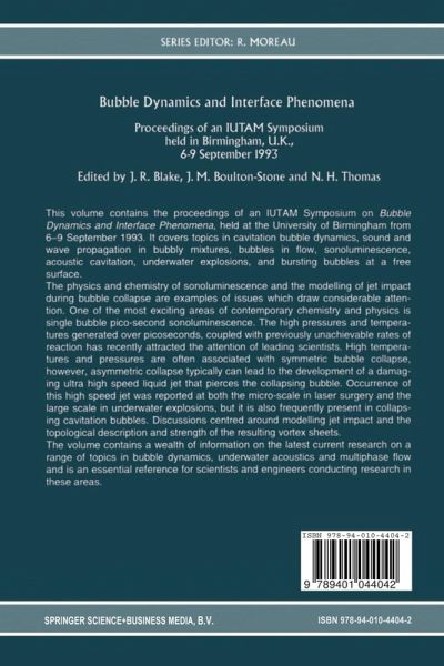 This volume contains papers presented at the IUTAM Symposium on Bubble Dynamics and Interface Phenomena held at the University of Birmingham from 6-9 September 1993. In many respects it follows on a decade later from the very successful IUTAM Symposium held at CALTECH in June 1981 on the Mechanics and physics of bubbles in liquids which was organised by the late Milton Plesset and Leen van Wijngaarden. The intervening period has seen major development with both experiment and theory. On the experimental side there have been ad vances with very high speed photography and data recording that provide detailed information on fluid and interface motion. Major developments in both computer hardware and software have also led to extensive improvement in our understand ing of bubble and interface dynamics although development is still limited by the sheer complexity of the laminar and turbulent flow regimes often associated with bubbly flows. The symposium attracts wide and extensive interest from engineers, physical, chemical, biological and medical scientists and applied mathematicians. The sci entific committee sought to achieve a balance between theory and experiment over a range of fields in bubble dynamics and interface phenomena. It was our intention to emphasise both the breadth and recent developments in these various fields and to encourage cross-fertilisation of ideas on both experimental techniques and theo retical developments. The programme, and the proceedings recorded herein, cover bubble dynamics, sound and wave propagation, bubbles in flow, sonoluminescence, acoustic cavitation, underwater explosions, bursting bubbles and ESWL.