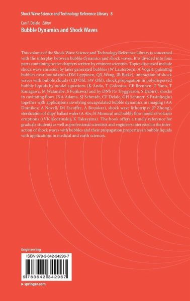 This volume of the Shock Wave Science and Technology Reference Library is concerned with the interplay between bubble dynamics and shock waves. It is divided into four parts containing twelve chapters written by eminent scientists. Topics discussed include shock wave emission by laser generated bubbles (W Lauterborn, A Vogel), pulsating bubbles near boundaries (DM Leppinen, QX Wang, JR Blake), interaction of shock waves with bubble clouds (CD Ohl, SW Ohl), shock propagation in polydispersed bubbly liquids by model equations (K Ando, T Colonius, CE Brennen. T Yano, T Kanagawa, M Watanabe, S Fujikawa) and by DNS (G Tryggvason, S Dabiri), shocks in cavitating flows (NA Adams, SJ Schmidt, CF Delale, GH Schnerr, S Pasinlioglu) together with applications involving encapsulated bubble dynamics in imaging (AA Doinikov, A Novell, JM Escoffre, A Bouakaz), shock wave lithotripsy (P Zhong), sterilization of ships' ballast water (A Abe, H Mimura) and bubbly flow model of volcano eruptions ((VK Kedrinskii, K Takayama). The book offers a timely reference for graduate students as well as professional scientists and engineers interested in the interaction of shock waves with bubbles and their propagation properties in bubbly liquids with applications in medical and earth sciences.