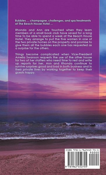 Rhonda and Ann are touched when they learn members of a small book club have saved for a long time to be able to spend a week at the Beach House Hotel. They arrange to put the five women in one of the two private homes on the property and promise to give them all the bubbles each one has requested as a surprise for the others. Things become complicated when Vice-President Amelia Swanson requests the use of the other house for two of her staffers who need time to rest and write up reports for her. Ann and Rhonda continue to survive surprises good and bad in both business and in their private lives by working together to keep their guests happy. Another of Judith Keim's series books celebrating love and families, strong women meeting challenges, and clean women's fiction with a touch of romance-beach reads for all ages with a touch of humor, satisfying twists, and happy endings.