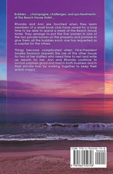 Rhonda and Ann are touched when they learn members of a small book club have saved for a long time to be able to spend a week at the Beach House Hotel. They arrange to put the five women in one of the two private homes on the property and promise to give them all the bubbles each one has requested as a surprise for the others. Things become complicated when Vice-President Amelia Swanson requests the use of the other house for two of her staffers who need time to rest and write up reports for her. Ann and Rhonda continue to survive surprises, good and bad, in both business and their private lives by working together to keep their guests happy. Another of Judith Keim's series books celebrating love and families, strong women meeting challenges, and clean women's fiction with a touch of romance-beach reads for all ages with a touch of humor, satisfying twists, and happy endings.