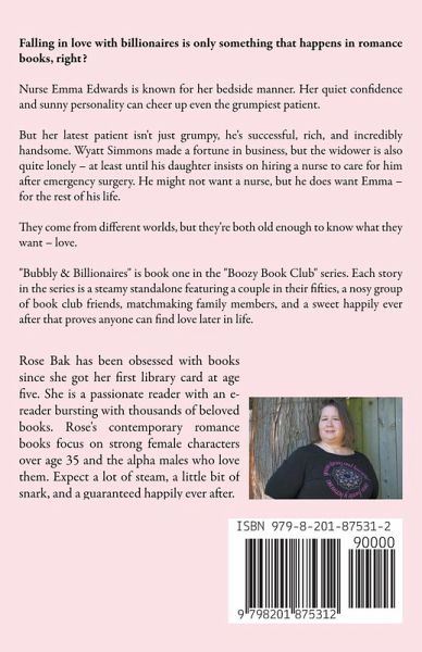 Falling in love with billionaires is only something that happens in romance books, right? Nurse Emma Edwards is known for her bedside manner. Her quiet confidence and sunny personality can cheer up even the grumpiest patient. But her latest patient isn't just grumpy, he's successful, rich, and incredibly handsome. Wyatt Simmons made a fortune in business, but the widower is also quite lonely - at least until his daughter insists on hiring a nurse to care for him after emergency surgery. He might not want a nurse, but he does want Emma - for the rest of his life. They come from different worlds, but they're both old enough to know what they want - love. "Bubbly & Billionaires" is book one in the "Boozy Book Club" series. Each story in the series is a steamy standalone featuring a couple in their fifties, a nosy group of book club friends, matchmaking family members, and a sweet happily ever after that proves anyone can find love later in life.