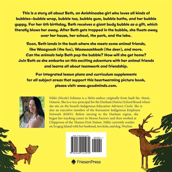 This is a story all about Beth, an Anishinaabe girl who loves all kinds of bubbles-bubble wrap, bubble tea, bubble gum, bubble baths, and her bubble guppy. For her 6th birthday, Beth receives a giant body bubble as a gift, which literally blows her away. After Beth gets trapped in the bubble, she floats away over her house, her school, the park, and the lake. Soon, Beth lands in the bush where she meets some animal friends, like Waagoosh (the fox), Waawaashkesh (the deer), and more. Can the animals help Beth pop the bubble? How will she get home? Join Beth as she embarks on this exciting adventure with her animal friends and learns all about teamwork and friendship. For integrated lesson plans and curriculum supplements for all subject areas that support this heartwarming picture book, please visit: www.goodminds.com