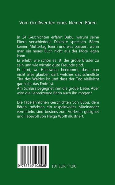 Vierundzwanzig Geschichten für Kinder und Junggebliebene, in denen der Bär Bubu mit Familie und Freunden vieles erlebt. Warum sprechen seine Eltern verschiedene Dialekte? Muss er Angst vor Bienen haben? Weshalb haben Bären keinen Muttertag? Was passiert, wenn man ein neues Buch nicht aus der Pfote legen kann? Bubu erfährt außerdem, wie schön es ist, der große Bruder zu sein, wie wichtig gute Freunde sind, wo Halloween herkommt und dass man nicht alles glauben darf. Er lernt das schnellste Tier des Waldes kennen und dass der Tod vielleicht gar nicht das Ende ist. Und natürlich begegnet ihm auch die große Liebe.…mehr