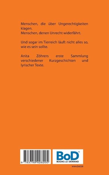 Menschen, die über Ungerechtigkeiten klagen. Menschen, denen Unrecht widerfährt. Und sogar im Tierreich läuft nicht alles so, wie es sein sollte.Anita Zöhrers erste Sammlung verschiedener Kurzgeschichten und lyrischer Texte.