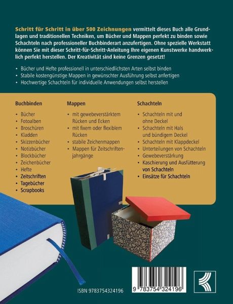 Schritt für Schritt in über 500 Zeichnungen vermittelt dieses Buch alle Grundlagen und traditionellen Techniken, um Bücher und Mappen perfekt zu binden sowie Schachteln nach professioneller Buchbinderart anzufertigen. Ohne spezielle Werkstatt können Sie mit dieser Schritt-für-Schritt-Anleitung Ihre eigenen Kunstwerke handwerklich perfekt herstellen. Der Kreativität sind keine Grenzen gesetzt!- Bücher und Hefte professionell in unterschiedlichsten Arten selbst binden- Stabile kostengünstige Mappen in gewünschter Ausführung selbst anfertigen- Hochwertige Schachteln für individuelle Anwendungen selbst herstellenBuchbinden- Bücher- Fotoalben- Broschüren- Kladden- Skizzenbücher- Notizbücher- Blockbücher- Zeichenbücher- Hefte- Zeitschriften- Tagebücher- ScrapbooksMappen- mit gewebeverstärktem Rücken und Ecken- mit fixem oder flexiblem Rücken- stabile Zeichenmappen- Mappen für ZeitschriftenjahrgängeSchachteln- Schachteln mit und ohne Deckel- Schachteln mit Hals und bündigem Deckel- Schachteln mit Klappdeckel- Unterteilungen von Schachteln- Gewebeverstärkung- Kaschierung und Ausfütterung von Schachteln- Einsätze für SchachtelnMit mehr als 500 Schritt für Schritt Zeichnungen.Profi-Tipps zu Papier, Werkzeug und Techniken.Kreative GestaltungsfreiheitDiese Ausgabe beinhaltet die Ausgaben "Bücher perfekt selbst binden" und "Schachteln und Mappen perfekt selbst gemacht" in einem Band.