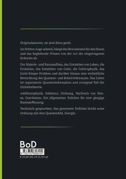 Originalautoren, sie sind dünn gesät. Im Dritten Auge sehend, hängt das Bewusstsein für den Raum und das begleitende Wissen von der Art der eingetragenen Kriterien ab.Der Materie- und Raumaufbau, das Entstehen von Leben, die Evolution, das Entstehen von Geist, die Gehirnphysik, das Geist-Körper-Problem und darüber hinaus eine einheitliche Betrachtung des Quanten- und Relativitätsraums. Das Leben ist organisierte Quanteninformation und zwingend Teil der Einheitstheorie.Additionsphysik, Substanz, Ordnung, Nachweis von Masse, Gravitation. Ein allgemeines Teilchen für eine gängige Raumauffassung.Technisch gesprochen: Das generierte Teilchen bricht seine Ordnung mit dem Quantenfeld. Energie.