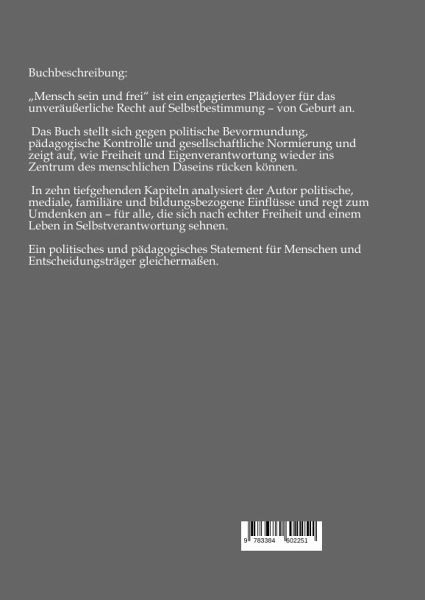 Buchbeschreibung:"Mensch sein und frei" ist ein engagiertes Plädoyer für das unveräußerliche Recht auf Selbstbestimmung - von Geburt an. Das Buch stellt sich gegen politische Bevormundung, pädagogische Kontrolle und gesellschaftliche Normierung und zeigt auf, wie Freiheit und Eigenverantwortung wieder ins Zentrum des menschlichen Daseins rücken können. In zehn tiefgehenden Kapiteln analysiert der Autor politische, mediale, familiäre und bildungsbezogene Einflüsse und regt zum Umdenken an - für alle, die sich nach echter Freiheit und einem Leben in Selbstverantwortung sehnen. Ein politisches und pädagogisches Statement für Menschen und Entscheidungsträger gleichermaßen.