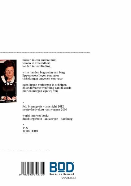 Annie Reniers (*Brüssel, 1941) Ihre Texte gehen unter die Haut, sie sind auch auf Wanderungen geborene Philosophie, als Professorin für Sprache (Germanistik) und Ästhetik ist sie belesen und blickt auch deshalb auf ein reichhaltiges Werk. BUCHSTABENLICHT ist ein dreisprachiges Werk der Dichterin aus der belgischen Hauptstadt und ein guter Einblick in das Schaffen von Annie Reniers. * Annie Reniers, Brussel, 14 mei 1941, dichteres, Professor in de Esthetica aan de VUB, ontving de eerste Hughues C. Pernath prijs voor haar hele oeuvre dat nu uit een twintigtal bundels bestaat, waaronder enkele in het Frans. Haar teksten zijn indringend, waarbij wandelingen in de natuur tot filosofische overwegingen leiden, geschraagd door haar grote belezenheid en menselijke kennis. Deze bundel biedt een overzicht van haar rijke oeuvre. Annie's werk is helder, straalt vol licht dat ze steeds weer opzoekt in leven en werk. Zij verlicht, verlucht de taal met geheimzinnig mooie woordvormingen en sobere zegging. Bij het vertalen van haar werk verleiden de rijke taal, het etherische en het erudiete tot bedachtzame langzaamheid. Dit biedt een liefdevolle uitdaging haar terug te vinden in het licht. * Annie Reniers (Brussels, May 14, 1941) poetess and professor in Aesthetics at the Free University of Brussels, received the first Hughues C. Pernath prize for her complete work, existing today of about twenty books of poetry, some of them in French. Her texts are probing, while her walks in nature lead to philosophical musings supported by her wide reading and knowledge of the human soul. This book gives an overview of her rich oeuvre. Annie's work is clear, shines brightly in the light she looks for in life and work. She illuminates, rarefies language with mysteriously beautiful word formations and a sober style. In translating her work the rich language, the ethereal and her erudition seduce to thoughtful slowness. So it becomes a loving challenge to rediscover her in the light. * * *