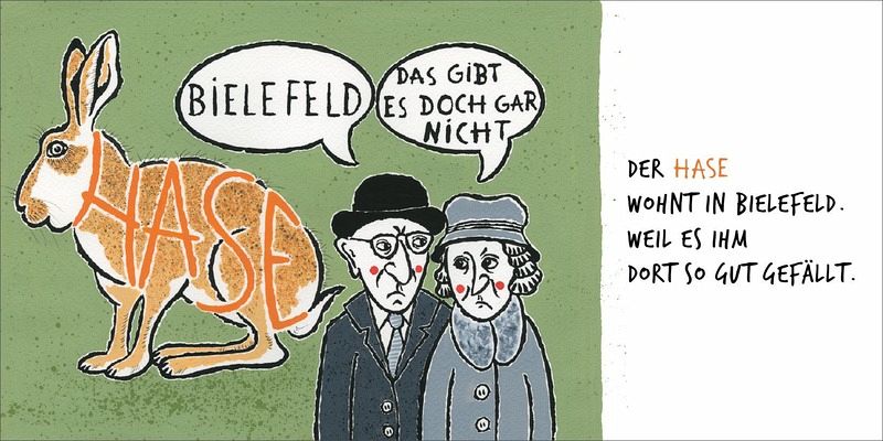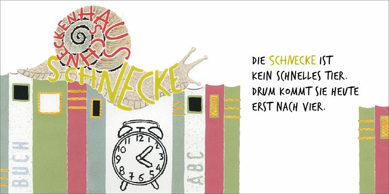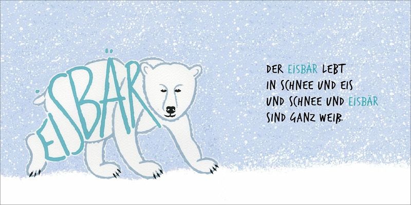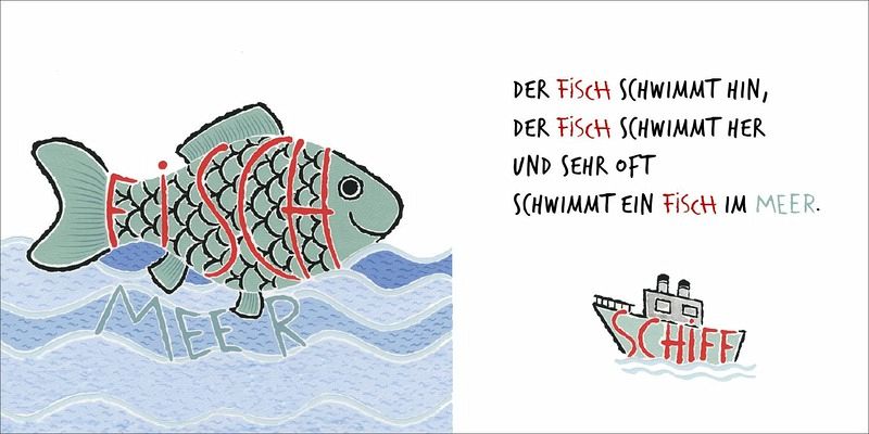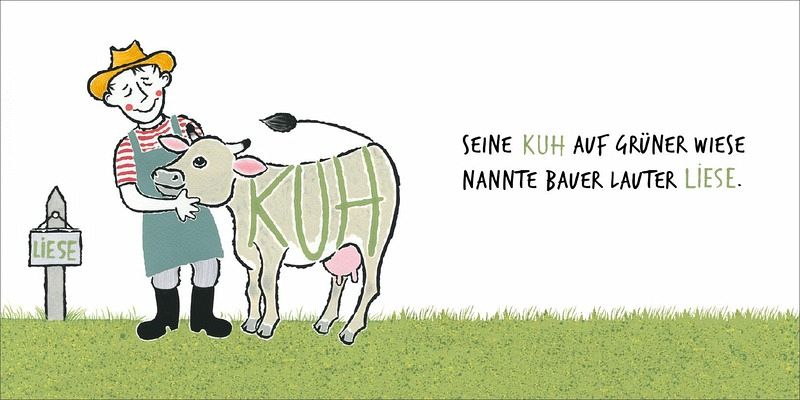 Zwischen den Schuppen des Fisches kann man die Buchstaben „FISCH“ lesen, auch das Meer und das Schiff sind mit ihrem Namen versehen. Der kleine gereimte Text lebt vom Wiederholen der Worte. „Seine Kuh auf grüner Wiese nannte Bauer Lauter Liese“ daneben sehen wir die zartgrüne Kuh mit ebendiesen Buchstaben. Die Ziege erfährt auf der nächsten Seite, dass es Erdbeereis gibt, dass ihr im Hörnchen angereicht wird. Da der Hase in Bieelfeld wohnt, kann man in den Sprechblasen lesen „Bielefeld“ „Das gibt es doch gar nicht“ ein Gag für die Erwachsenen, aber den Kinder schwierig zu erklären. Eisbär, Schnecke, Fuchs, Giraffe, Katze, Löwe und Maus werden in kurzen witzigen Reimen vorgestellt und zuletzt geht es um den Wal. „Neulich traf ich einen Wal, doch das war nicht in Wuppertal.“ Das hätte mich auch gewundert.