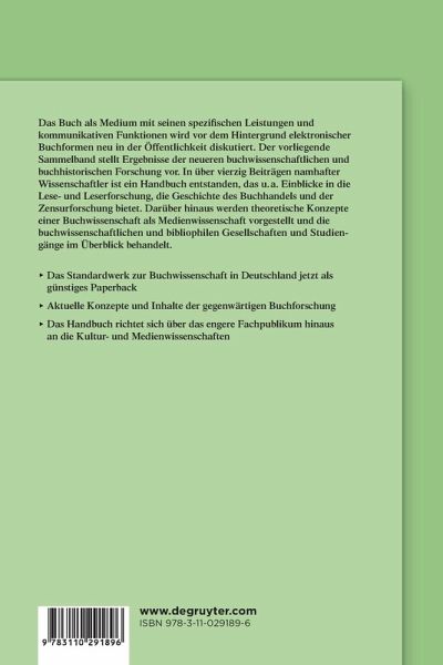In der Auseinandersetzung mit den modernen Digitalmedien ist das Buch als Medium mit seinen spezifischen Leistungen und kommunikativen Angeboten in den letzten Jahren in den Blick einer breiteren Öffentlichkeit geraten. Der vorliegende Sammelband stellt Ergebnisse buchwissenschaftlicher Forschung, Institutionen und Gesellschaften der Fachkommunikation, Konzepte buchwissenschaftlicher Lehre, bibliophile Gesellschaften und Forschungsbibliotheken vor. In über vierzig Beiträgen namhafter Wissenschaftler ist ein Handbuch entstanden, das über das engere Fachpublikum hinaus den historischen Nachbardisziplinen, den Kultur- und Medienwissenschaften einen Überblick über die Buchforschung in Deutschland bietet.