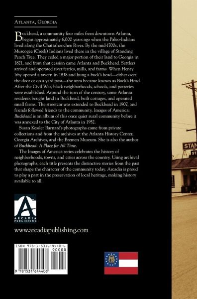 Buckhead, a community four miles from downtown Atlanta, began approximately 6,000 years ago when the Paleo-Indians lived along the Chattahoochee River. By the mid-1700s, the Muscogee (Creek) Indians lived there in the village of Standing Peach Tree. They ceded a major portion of their land to Georgia in 1821, and from that cession came Atlanta and Buckhead. Settlers arrived and operated river ferries, mills, and farms. When Henry Irby opened a tavern in 1838 and hung a buck's head--either over the door or on a yard post--the area became known as Buck's Head. After the Civil War, black neighborhoods, schools, and potteries were established. Around the turn of the century, some Atlanta residents bought land in Buckhead, built cottages, and operated small farms. The streetcar was extended to Buckhead in 1907, and friends followed friends to the community. Images of America: Buckhead is an album of this once quiet rural community before it was annexed to the City of Atlanta in 1952.