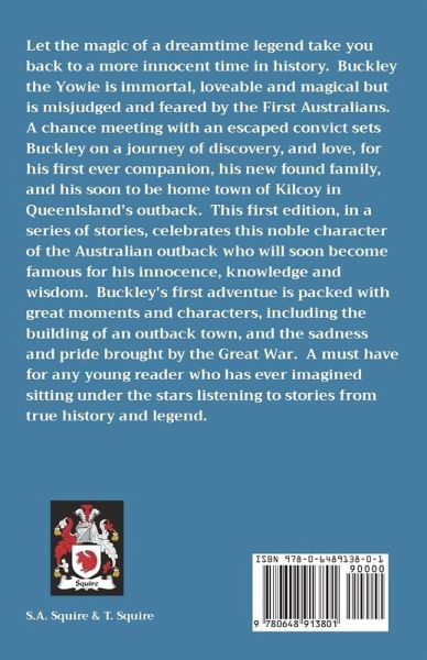 Let the magic of a Dreamtime legend take you back to a more innocent time in history. Buckley the Yowie is immortal, loveable, and magical, but is misjudged and feared by the First Australians. A chance meeting with an escaped convict sets Buckley on a journey of discovery, and love, for his first ever companion, his new found family, and his soon to be home town of Kilcoy, in Queensland's Outback. This first edition, in a series of stories, celebrates this noble character of the Australian Outback who will soon become famous for his innocence, knowledge and wisdom. Buckley's first adventure is packed with great moments and characters, including the building of an outback town, and the sadness and pride brought by the Great War. A must have for any young reader who has ever imagined sitting under the stars listening to stories from true history and legend.