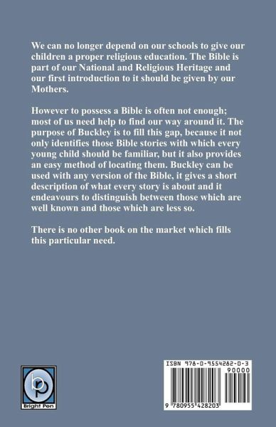We can no longer depend on our schools to give our children a proper religious education. The Bible is part of our National and Religious Heritage and our first introduction to it should be given by our Mothers. However to possess a Bible is often not enough; most of us need help to find our way around it. The purpose of Buckley is to fill this gap, because it not only identifies those Bible stories with which every young child should be familiar, but it also provides an easy method of locating them. Buckley can be used with any version of the Bible, it gives a short description of what every story is about and it endeavours to distinguish between those which are well known and those which are less so. There is no other book on the market which fills this particular need.