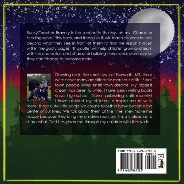 Bucky Teaches Bravery is the second in the My, oh my! Character building series. This book, and those like it, will teach children to look beyond what they see in front of them to find the lesson hidden within the goofy pages. This outlet will help children grow and learn with fun characters and character building stories and references so they can choose to become more. Growing up in the small town of Foxworth, MS, there were never many ambitions for more out of life. Small town people living small town dreams. My biggest dream has been to write. I have been writing books since high-school. Never publishing until recently! I have allowed my children to inspire me to write more. These cute little books we create together have become the center of our lives. We talk about them all the time. They make me happy because they bring my children such joy. It is my pleasure to share what God has given me through my children with the world.