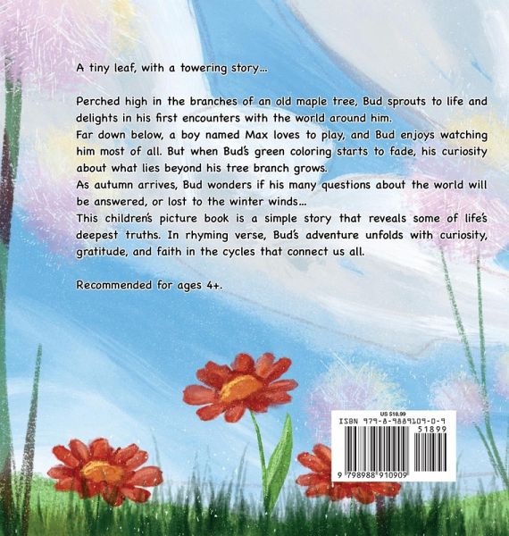 A tiny leaf with a grand tale to tell, Bud is a heartwarming story of discovery and change. High in the swaying branches of an ancient maple tree, Bud awakens to life, marveling at the vibrant world around him. Each morning, he basks in the golden sunlight, dances in the cool breezes, and listens to the symphony of rustling leaves. Below, a lively boy named Max plays beneath the tree, filling the air with laughter and joy. Of all the sights Bud observes, Max is his favorite-a source of endless fascination and delight. As time passes, Bud begins to notice changes within himself. His once-brilliant green starts to fade, and he feels the stirrings of curiosity about what lies beyond his perch. What exists past the safety of his tree branch? Is there more to life than the view from above?