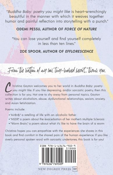 From the bottom of my low, tiny-boobed heart, thank you. Christina Gayton welcomes you to her world in Buddha Baby. If you like depressing, and/or sarcastic poetry, then this collection is for you. Not one to shy away from personal topics, Gayton writes about alcoholism, abuse, dysfunctional relationships, sexism, anxiety, and Asian fetishization. Poems include: "AirBnB," a retelling of life with an alcoholic father "MSDP," a poem about the exacerbation of her mother's Multiple Sclerosis "Worm Brain," a poem about what it's like to have the brain of a worm Christina hopes you can empathize with the experiences she shares in this book and find comfort in the shared pain of the human experience. If you like overly personal spoken word with sarcastic undertones, this book is for you!
