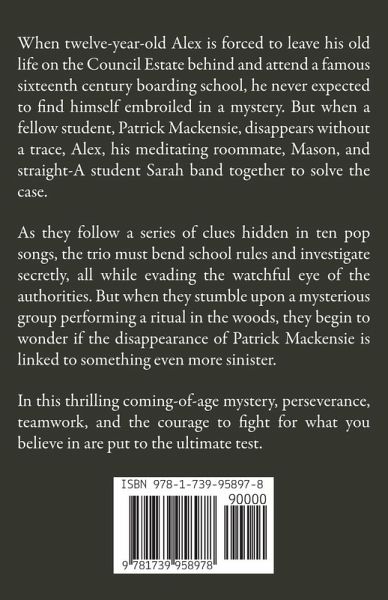 When twelve-year-old Alex is forced to leave his old life on the Council Estate behind and attend a famous sixteenth century boarding school, he never expected to find himself embroiled in a mystery. But when a fellow student, Patrick Mackensie, disappears without a trace, Alex, his meditating roommate, Mason, and straight-A student Sarah band together to solve the case. As they follow a series of clues hidden in ten pop songs, the trio must bend school rules and investigate secretly, all while evading the watchful eye of the authorities. But when they stumble upon a mysterious group performing a ritual in the woods, they begin to wonder if the disappearance of Patrick Mackensie is linked to something even more sinister. In this thrilling coming-of-age mystery, perseverance, teamwork, and the courage to fight for what you believe in are put to the ultimate test.