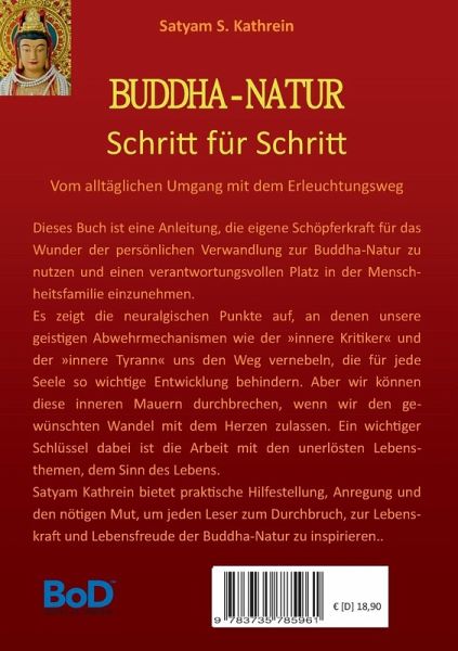 Dieses Buch ist eine Anleitung, die eigene Schöpferkraft für das Wunder der persönlichen Verwandlung zur Buddha-Natur zu nutzen und einen verantwortungsvollen Platz in der Menschheitsfamilie einzunehmen. Es zeigt die neuralgischen Punkte auf, an denen unsere geistigen Abwehrmechanismen wie der »innere Kritiker« und der »innere Tyrann« uns den Weg vernebeln, die für jede Seele so wichtige Entwicklung behindern. Aber wir können diese inneren Mauern durchbrechen, wenn wir den gewünschten Wandel mit dem Herzen zulassen. Ein wichtiger Schlüssel dabei ist die Arbeit mit den unerlösten Lebensthemen, dem Sinn des Lebens. Satyam Kathrein bietet praktische Hilfestellung, Anregung und den nötigen Mut, um jeden Leser zum Durchbruch, zur Lebenskraft und Lebensfreude der Buddha-Natur zu inspirieren.