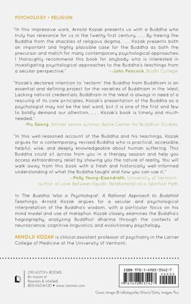 In The Buddha Was a Psychologist: A Rational Approach to Buddhist Teachings, Arnold Kozak argues for a secular and psychological interpretation of the Buddha's wisdom, with a particular focus on his mind model and use of metaphor. Kozak closely examines the Buddha's hagiography, analyzing Buddhist dharma through the contexts of neuroscience, cognitive linguistics, and evolutionary psychology.