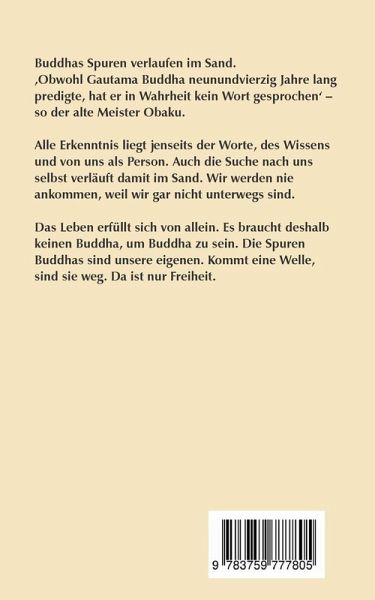 Buddhas Spuren verlaufen im Sand. Nach dem alten Meister Obaku hat Buddha neunundvierzig Jahre gepredigt und dabei in Wahrheit kein Wort gesprochen. Entsprechend liegt alle Erkenntnis jenseits der Worte, des Wissens und von uns als Person. Auch die Suche nach "uns selbst" verläuft damit im Sand. Wir werden nie ankommen, weil wir gar nicht unterwegs sind. Effektiv erfüllt sich das Leben selbst, und es braucht keinen Buddha, um Buddha zu sein. Die Spuren Buddhas sind unsere eigenen. Kommt eine Welle, sind sie weg. Da ist nur Freiheit.