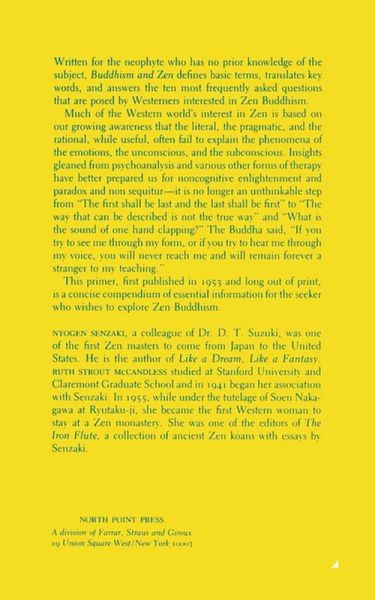 This primer, first published in 1953 and long out of print, is a concise compendium of essential information for the seeker who wishes to explore Zen Buddhism. Written for the neophyte who has no prior knowledge of the subject, Buddhism and Zen defines basic terms, translates key words, and answers the ten most frequently asked questions that are posed by Westerners interested in Zen Buddhism. Much of the Western world's interest in Zen is based on our growing awareness that the literal, the pragmatic, and the rational, while useful, often fail to explain the phenomena of the emotions, the unconscious, and the subconscious. Insights gleaned from psychoanalysis and various other forms of therapy have better prepared us for noncognitive enlightenment and paradox and non sequitur--it is no longer an unthinkable step from "The first shall be last and the last shall be first" to "The way that can be described is not the true way" and "What is the sound of one hand clapping?" The Buddha said, "If you try to see me through my form, or if you try to hear me through my voice, you will never reach me and will remain forever a stranger to my teaching."