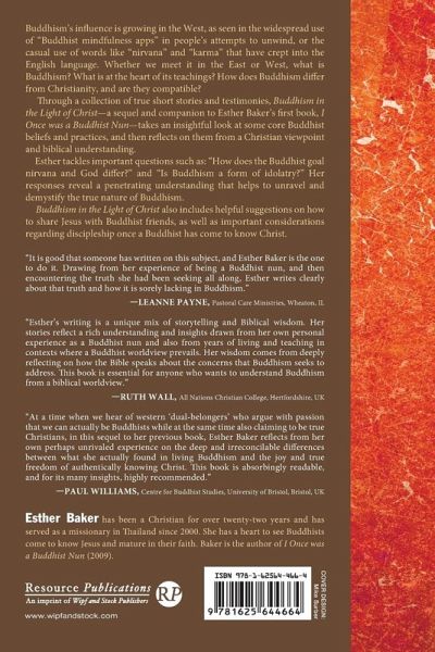 Buddhism's influence is growing in the West, as seen in the widespread use of ""Buddhist mindfulness apps"" in people's attempts to unwind, or the casual use of words like ""nirvana"" and ""karma"" that have crept into the English language. Whether we meet it in the East or West, what is Buddhism? What is at the heart of its teachings? How does Buddhism differ from Christianity, and are they compatible? Through a collection of true short stories and testimonies, Buddhism in the Light of Christ--a sequel and companion to Esther Baker's first book, I Once was a Buddhist Nun--takes an insightful look at some core Buddhist beliefs and practices, and then reflects on them from a Christian viewpoint and biblical understanding. Esther tackles important questions such as: ""How does the Buddhist goal nirvana and God differ?"" and ""Is Buddhism a form of idolatry?"" Her responses reveal a penetrating understanding that helps to unravel and demystify the true nature of Buddhism. Buddhism in the Light of Christ also includes helpful suggestions on how to share Jesus with Buddhist friends, as well as important considerations regarding discipleship once a Buddhist has come to know Christ.
