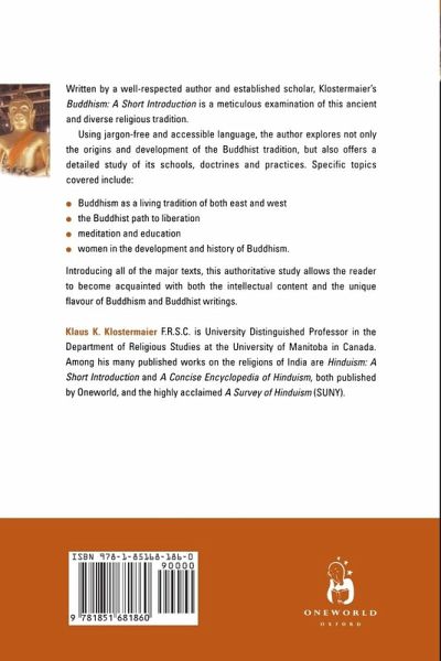 Written by a well-respected author and established scholar, Klostermaier's 'Buddhism: A Short Introduction' is a meticulous examination of this ancient and diverse religious tradition. Using jargon-free and accessible language, the author explores not only the origins and development of the Buddhist tradition, but also offers a detailed study of its schools, doctrines and practices. Specific topics include: ¿ Buddhism as a living tradition of both east and west ¿ the Buddhist path to liberation ¿ meditation and education ¿ women in the development and history of Buddhism Introducing all the major texts, this authoritative study allows the reader to become acquainted with both the intellectual content and the unique flavour of Buddhism and Buddhist writings.