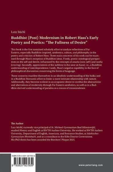 This book is the first sustained scholarly effort to analyze reflections of Far Eastern, especially Buddhist-inspired, aesthetics, culture, and philosophy in the poetry and criticism of Robert Hass. Three main concerns of his work can be examined through Hass's reception of Buddhist ideas. Firstly, poetic-ontological perspectives on the self and desire, influenced by the concepts of anatta (non-self ) and tanha (craving). Secondly, appreciations of the sublime in the near-at-hand, i.e., a Buddhist understanding of interdependence. Lastly, Hass's negative capability in the face of philosophical discussions concerning the limits of language. These concerns manifest themselves in an idealistic understanding of the haiku and in a Buddhist-Romantic effort to foster a more intimate relationship with nature. Additionally, they become evident in an ecopoetic desire to combat the abstractions and aberrations of modernity through Far Eastern aesthetics, as well as in a Buddhistderived understanding of paradox as a means of transcendence.