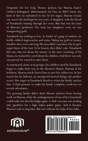 Desperate for her help, Horace Jackson has Shawna Kane's children kidnapped. Unfortunately for him, he didn't know the kind of fury he unleashed in her. In her anger, Shawna reveals one secret she had kept for ten years. A daughter, with the blood of Tomahawk running through her veins. But that was the least of Shawna's problems. The train her daughters were on was transporting gold. Tomahawk has nothing to lose. As leader of a gang of outlaws, he boldly robbed stagecoaches and trains. Taking any gold or money transfers they were carrying. His men didn't question why he gave equal shares of the loot. To be honest, they didn't care. Tomahawk did care, but not about the money or the men. Learning of his illness, he realized he cared about his children. And there was only one person he wanted to raise them. As instructed, alone or in groups, the children sired by Tomahawk began to make their way to the Shooter's Ranch. Furious at his boldness, Shawna tracks down Tom to save her oldest two. In her search for his hideout, an unexpected arrival brings out another secret. Her anger at Tomahawk dissolves when she finally catches him. A final promise to make his family complete, sends her on several adventures. The growing family didn't deter Horace Jackson from forcing work on Shawna. Only the endangerment of one of her household could make her don the badge again. A slick con man was stealing lady gamblers for a high stakes poker game. And it became Shawna's job to stop him. But not without the help of her tribe.