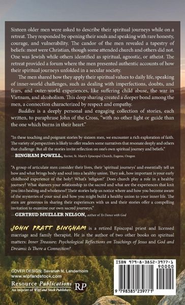 Sixteen older men were asked to describe their spiritual journeys while on a retreat. They responded by opening their souls and speaking with rare honesty, courage, and vulnerability. The candor of the men revealed a tapestry of beliefs: most were Christian, though some attended church and others did not. One was Jewish while others identified as spiritual, agnostic, or atheist. The retreat provided a forum where the men presented authentic accounts of how their spiritual journeys unfolded in a secular society. The men shared how they apply their spiritual values to daily life, speaking of inner-world challenges, such as dealing with imperfections, doubts, and fears, and outer-world experiences, like suffering child abuse, the war in Vietnam, and alcoholism. This deep sharing created a deeper bond among the men, a connection characterized by respect and empathy. Buddies is a deeply personal and engaging collection of stories, each written, to paraphrase John of the Cross, ""with no other light or guide than the one which burns in their heart.""