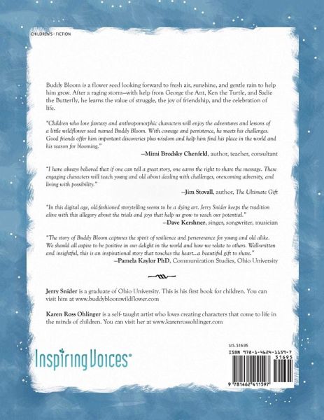 Buddy Bloom is a flower seed looking forward to fresh air, sunshine, and gentle rain to help him grow. After a raging storm-with help from George the Ant, Ken the Turtle, and Sadie the Butterfly, he learns the value of struggle, the joy of friendship, and the celebration of life. "Children who love fantasy and anthropomorphic characters will enjoy the adventures and lessons of a little wildflower seed named Buddy Bloom. With courage and persistence, he meets his challenges. Good friends offer him important discoveries plus wisdom and help him find his place in the world and his reason for blooming." -Mimi Brodsky Chenfeld, author, teacher, consultant "I have always believed that if one can tell a great story, one earns the right to share the message. These engaging characters will teach young and old about dealing with challenges, overcoming adversity, and living with possibility." -Jim Stovall, author, The Ultimate Gift "In this digital age, old-fashioned storytelling seems to be a dying art. Jerry Snider keeps the tradition alive with this allegory about the trials and joys that help us grow to reach our potential." -Dave Kershner, singer, songwriter, musician "The story of Buddy Bloom captures the spirit of resilience and perseverance for young and old alike. We should all aspire to be positive in our delight in the world and how we relate to others. Well-written and insightful, this is an inspirational story that touches the heart...a beautiful gift to share." -Pamela Kaylor PhD, Communication Studies, Ohio University